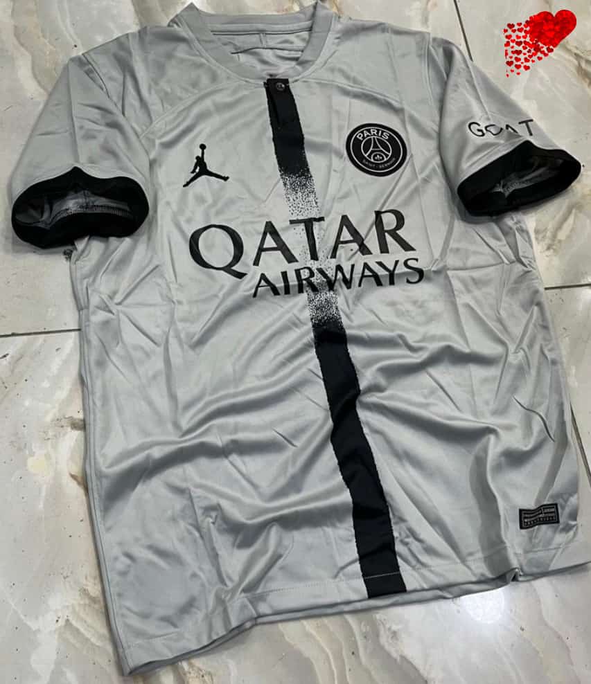 The Jordan PSG 2022-23 away jersey introduces a new look in grey with a black center stripe that fades in the center to make room for the Qatar Airways sponsor. Inside the collar is a special label.